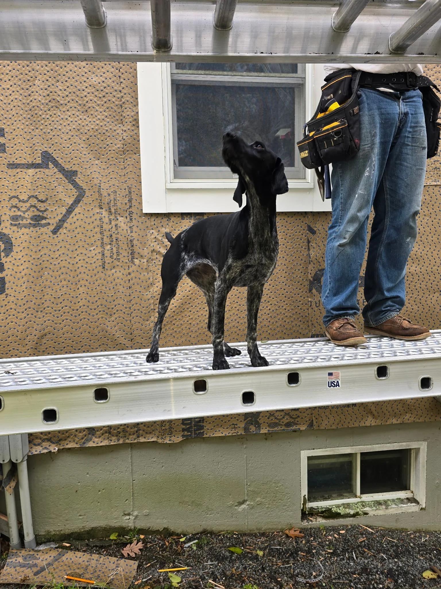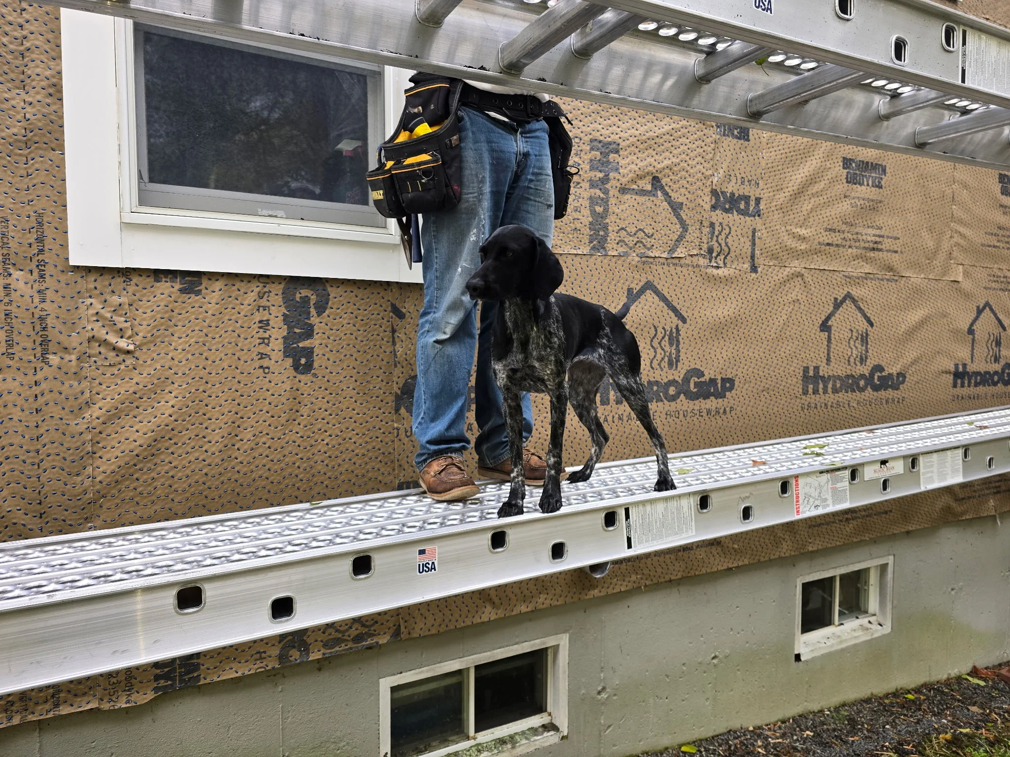 Before we could even lay out materials, Maple completed her own inspection of the ladder, the scaffolding, and every tool bag within reach. If there were an OSHA rulebook for dogs, she would’ve rewritten it.